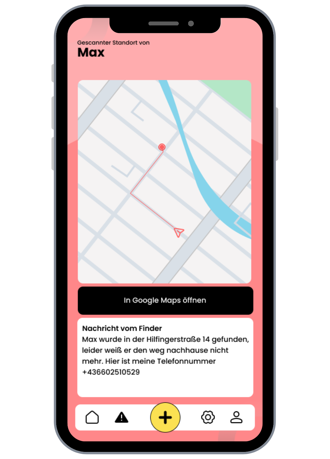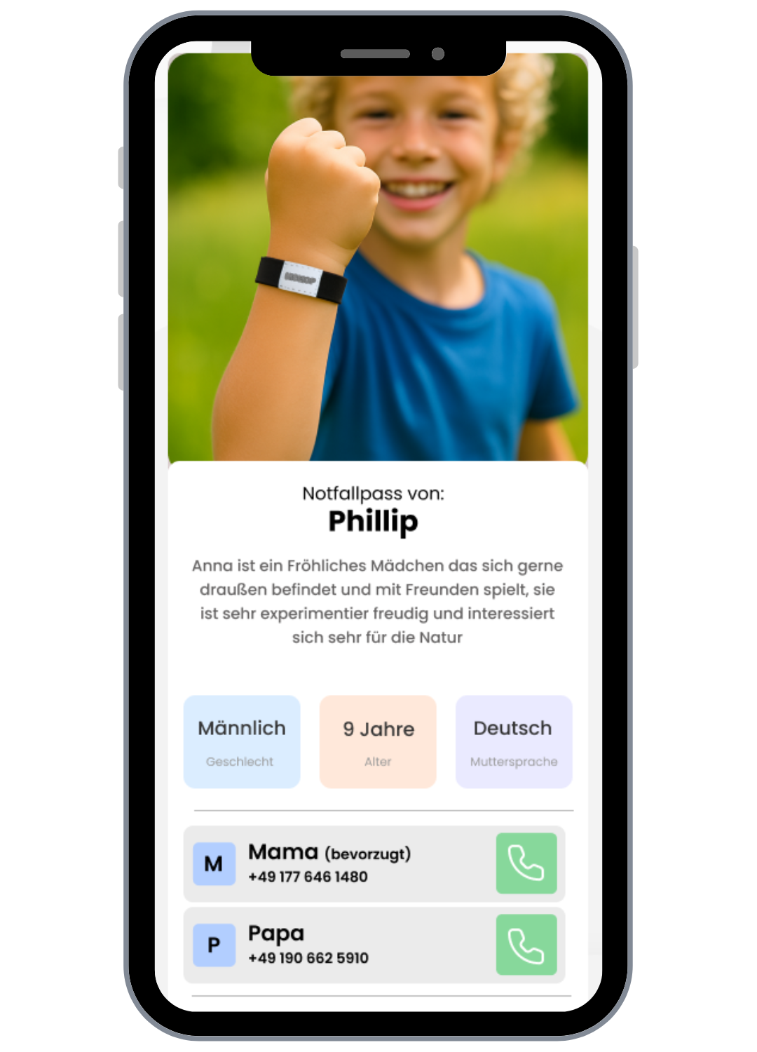 Beim Scannen des QR-Codes mit einem Smartphone öffnet sich ein digitales Notfallprofil. Dort sind alle hinterlegten Informationen sichtbar – zum Beispiel Name, Telefonnummer der Eltern oder medizinische Hinweise.