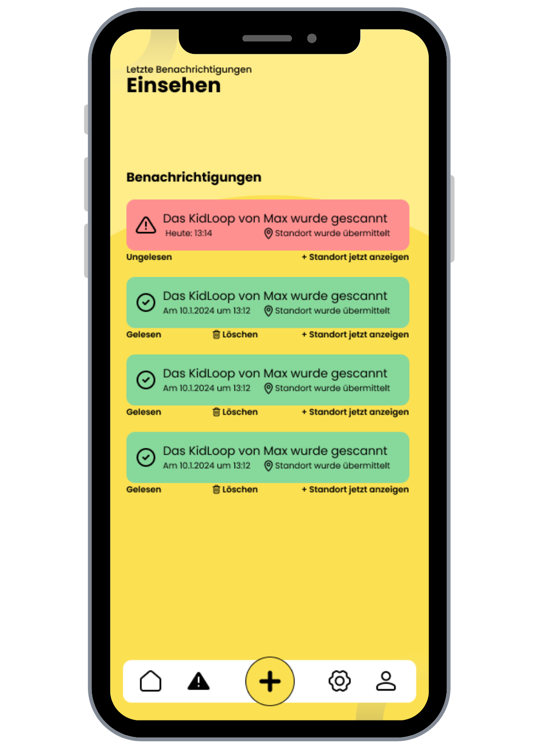 Jedes Mal, wenn jemand das KidLoop scannt, wirst du sofort benachrichtigt – per E-Mail, SMS und App. So weißt du sofort Bescheid.
